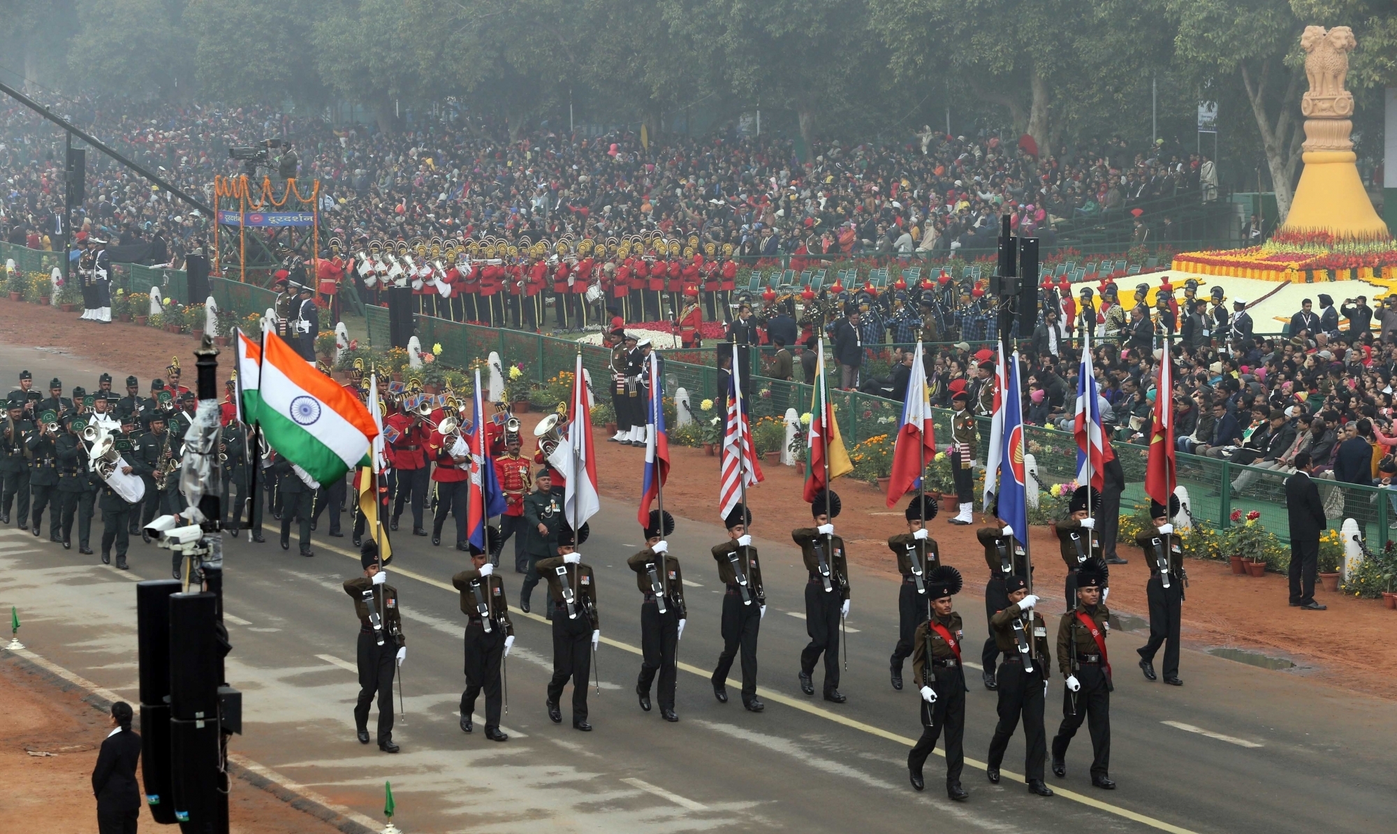 New Delhi: Indian Army Band drawn from 39 Gorkha Training Centre and 1 EME Centre, march on Rajpath with ASEAN flag and flags of the 10 ASEAN countries during Republic Day Parade 2018, in New Delhi Jan 26, 2018. (Photo: Amlan Paliwal/IANS)