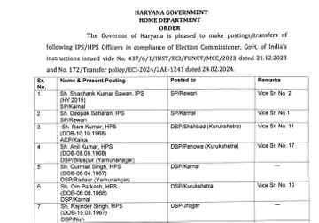हरियाणा में नायब सैनी के मुख्यमंत्री बनने के बाद बड़ा प्रशासनिक फेरबदल हुआ है। प्रदेश में करनाल-रेवाड़ी के SP समेत 18 पुलिस अधिकारियों का ट्रांसफर किया गया है। रेवाड़ी में शंशाक कुमार सावन और करनाल में दीपक सहारण को SP लगाया गया है। इसके अलावा, कई जगहों पर DSP और ACP भी बदले गए हैं।