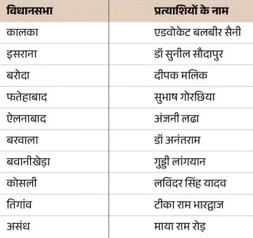 पानीपत ग्रामीण सीट से उम्मीदवार रघुनाथ कश्यप एक दिन पहले भाजपा छोड़कर जजपा जॉइन की थी।आदमपुर से उम्मीदवार कृष्ण गंगवा डिप्टी स्पीकर रणबीर गंगवा के रिश्तेदार हैं। रतिया से उम्मीदवार रमेश कुमार ओड विधायक लक्ष्मण नापा के समर्थक रहे हैं। लक्ष्मण नापा भाजपा से टिकट कटने के बाद कांग्रेस में शामिल हो चुके हैं।