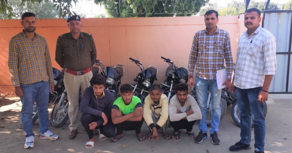 रोहतक पुलिस की एवीटी स्टाफ की टीम ने चोरी की वारदात को अंजाम देने वाले गिरोह का खुलासा करते हुए गिरोह मे शामिल चार आरोपियो को चोरीशुदा मोटरसाइकिल सहित गिरफ्तार करने मे सफलता प्राप्त की है। आरोपियो से चोरीशुदा अन्य 6 मोटरसाइकिलों को बरामद किया गया है। आरोपियो को आज पेश अदालत किया गया है। मामले की गहनता से जांच की जा रही है।