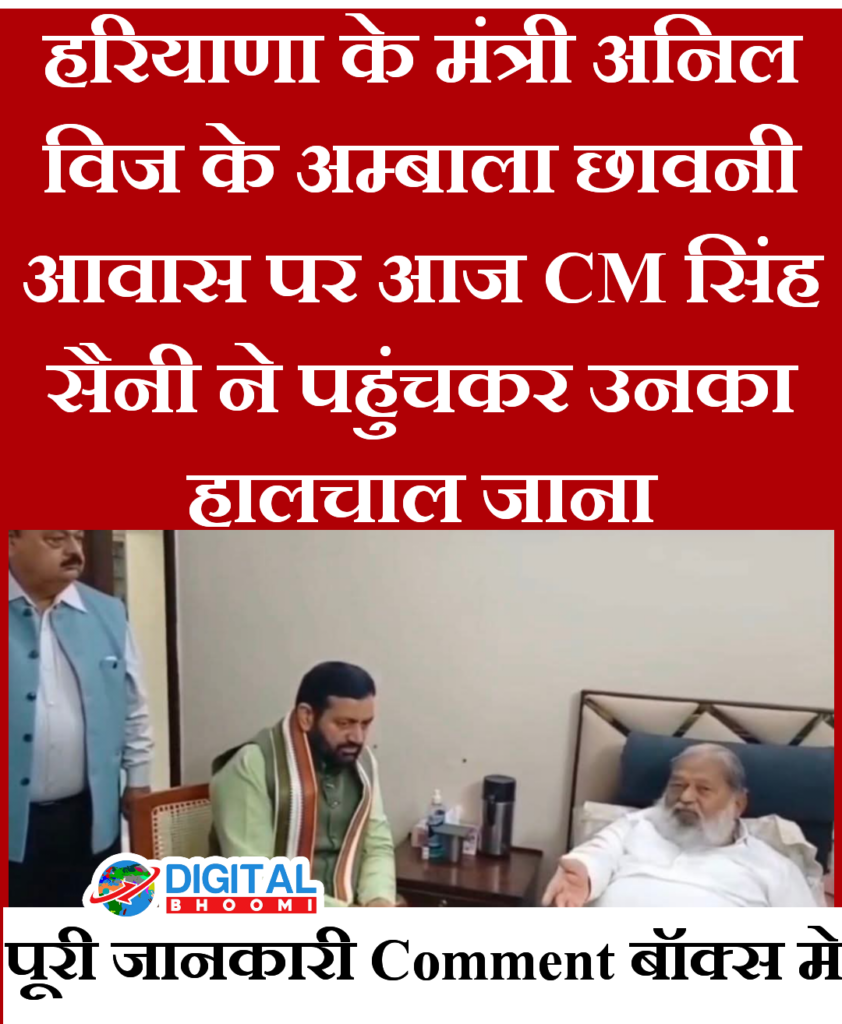 हरियाणा के सीएम नायब सैनी ने मंत्री अनिल विज के घर पहुंचकर उनसे मुलाकात की। दोनों नेताओं के बीच अंबाला कैंट स्थित विज के घर पर काफी देर तक बातचीत हुई। इस दौरान सीएम सैनी ने उनका हालचाल जाना।