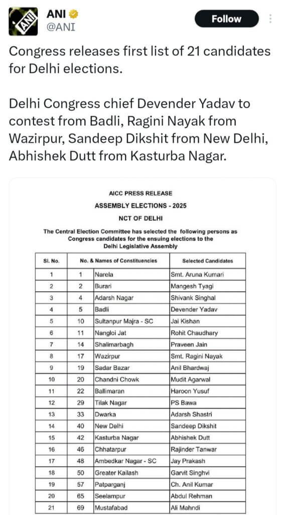 दिल्ली चुनाव, कांग्रेस की पहली लिस्ट में 21 नाम