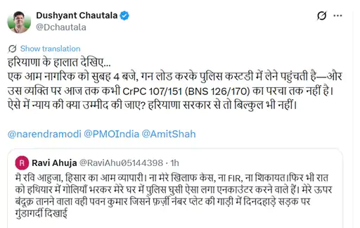 दुष्यंत चौटाला ने रवि आहुजा की पोस्ट को शेयर कर लिखा- “हरियाणा के हालात देखिए। एक आम नागरिक को सुबह 4 बजे गन लोड करके पुलिस कस्टडी में लेने पहुंचती है। उस व्यक्ति पर आज तक कोई पर्चा नहीं है। ऐसे में न्याय की क्या उम्मीद की जाए? हरियाणा सरकार से तो बिल्कुल भी नहीं।