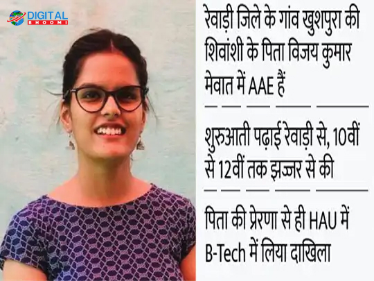 ISRO में चयनित चौ. चरण सिंह कृषि विश्वविद्यालय के एग्रीकल्चर इंजीनियरिंग एंड टेक्नोलॉजी कॉलेज की छात्रा शिवांशी यादव मूल रूप से रेवाड़ी जिले के गांव खुशपुरा की रहने वाली है। शुरुआती पढ़ाई रेवाड़ी से, जबकि दसवीं के बाद 12वीं तक की पढ़ाई झज्जर से की है। उसके बाद B-Tech के लिए HAU में दाखिला हो गया। पिता इंजीनियर विजय कुमार मेवात में कृषि विभाग में सहायक कृषि अभियंता के पद पर कार्यरत हैं, जबकि माता पुष्पा यादव गृहिणी हैं। इस क्षेत्र में आने के लिए शिवांशी को प्रेरणा अपने पिता से मिली है।