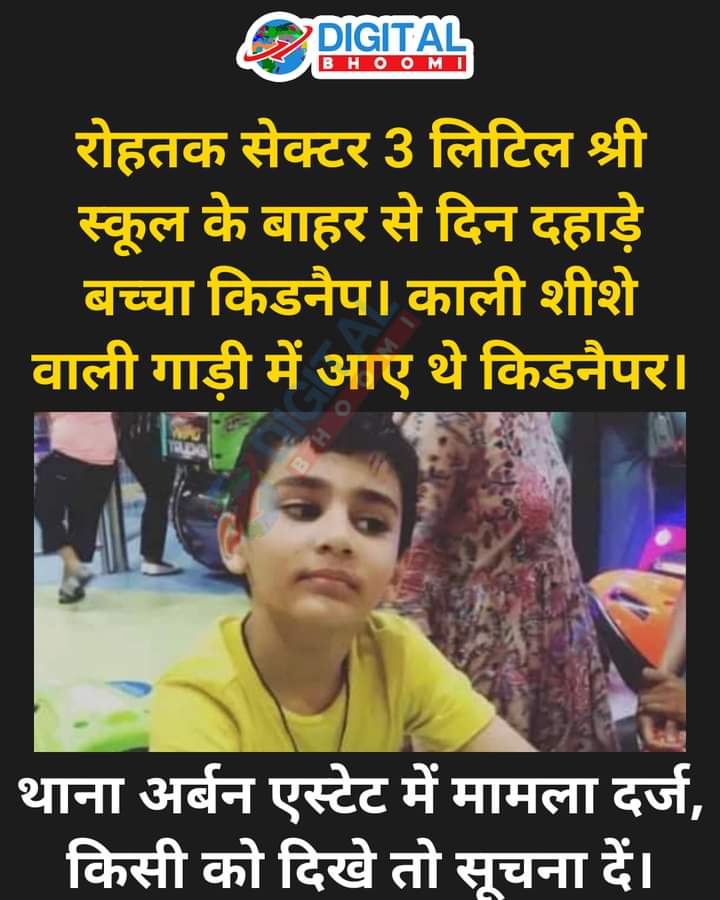 रोहतक के सेक्टर-3 में द लिटिल श्री स्कूल के सामने से दूसरी क्लास में पढ़ने वाले बच्चे का दिन-दहाड़े अपहरण कर लिया गया। मामले में अपहरण के आरोप में बच्चे के पिता व बुआ पर ही लगा है। नाना उद्योगपति सुरेंद्र दांगी ने दोनों पर केस दर्ज कराया है। आरोप है कि बच्चे के परनाना छुट्टी के समय जब उसे स्कूल से लेकर घर आने के लिए कार में बिठाने लगे तभी उसे पिता मनोज व बुआ उसे जबरन छीन कर ले गए। पुलिस ने नाकाबंदी करवाई और वाहनाें की जांच शुरू कर दी।