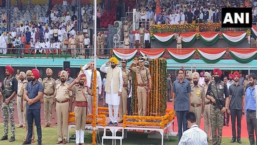 Independence Day 2022: पंजाब के लुधियाना में सोमवार को गुरू नानक स्टेडियम में 75वां आजादी दिवस पर मुख्यमंत्री भगवंत सिंह ने तिरंगा फहराया। इस दौरान उन्होंने परेड की सलामी ली। मुख्यमंत्री भगवंत सिंह मान ने संबोधित करते हुए कहा कि आजादी की 75वीं वर्षगांठ पर सभी पंजाबियों को लख-लख बधाइयां और शुभकामनाएं। आज देश के लिए बहुत खास दिन है। आज से 75 साल पहले यह तिरंगा इस तरह नहीं झूलता था। इसकी जगह कोई और झंडा था। हमारे युवाओं ने यह सपना देखा देश हमारा है लेकिन झंडा किसी और देश का क्यों। वह आजादी के आंदोलन में कूद पड़े।