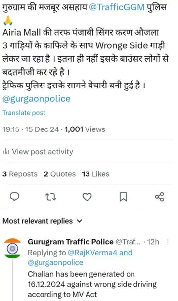 एक X यूजर ने लिखा- एयरिया मॉल की तरफ पंजाबी सिंगर करण औजला के काफिले की 3 गाड़ियां रॉन्ग साइड से जा रही हैं और बाउंसर्स भी लोगों के साथ बदतमीजी कर रहे हैं, लेकिन गुरुग्राम पुलिस सो रही है। इस पर गुरुग्राम पुलिस ने भी जवाब दिया और कहा कि गलत दिशा में गाड़ी चलाने पर पुलिस ने इन गाड़ियों का चालान काटा है। पुलिस ने बताया कि गाड़ी में गाना बजाने, रॉन्ग साइड चलने और रैश ड्राइविंग पर पुलिस ने एक्शन लिया है।