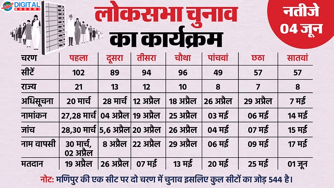 Lok Sabha Elections Schedule 2024 : लोकसभा चुनावों की आज घोषणा कर दी गई है, जो 7 चरणों में पूरे होंगे। लोकसभा चुनाव के लिए मतदान 19 अप्रैल से शुरू होकर 1 जून को खत्म होगा और सभी के नतीजे एक साथ चार जून को आएंगे।
