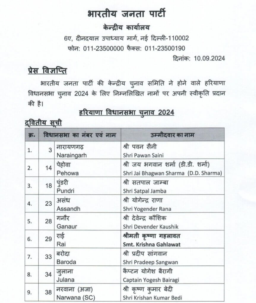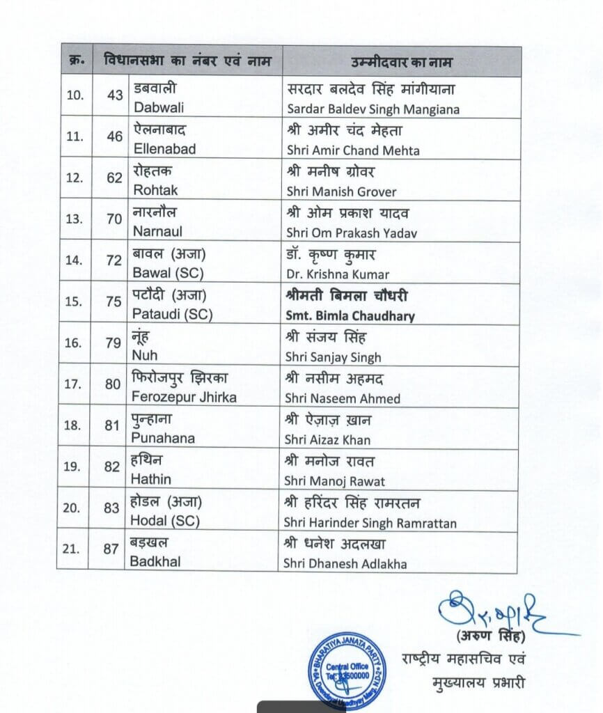 भाजपा ने पहली लिस्ट में 67 उम्मीदवारों की घोषणा की थी। भाजपा अब तक 90 में से 87 सीटों पर उम्मीदवारों का ऐलान कर चुकी है। अब महेंद्रगढ़, सिरसा और फरीदाबाद NIT से उम्मीदवार की घोषणा बाकी है।हरियाणा में 12 सितंबर तक नामांकन होना है। 4 अक्टूबर को वोटिंग होगी और 8 अक्टूबर को नतीजे घोषित किए जाएंगे।