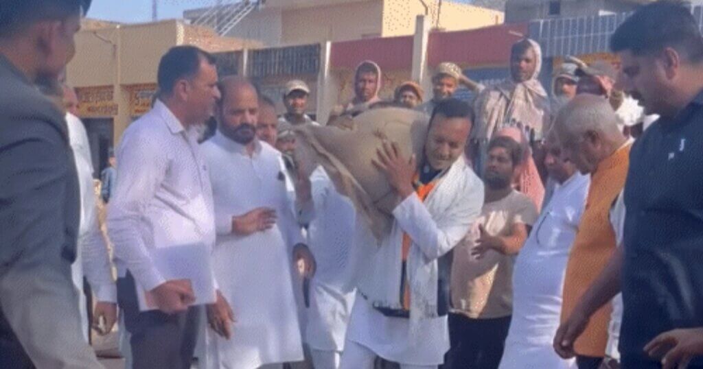 नवीन जिंदल गेहूं की बोरी ट्रक में रखने के बाद समर्थकों के जोश वर्धन के लिए हाथ जोड़कर अभिवादन करते नजर आए। वह यहां चुनाव प्रचार करने पहुंचे थे। उन्होंने भाजपा का पटका भी गले में डाला हुआ था।