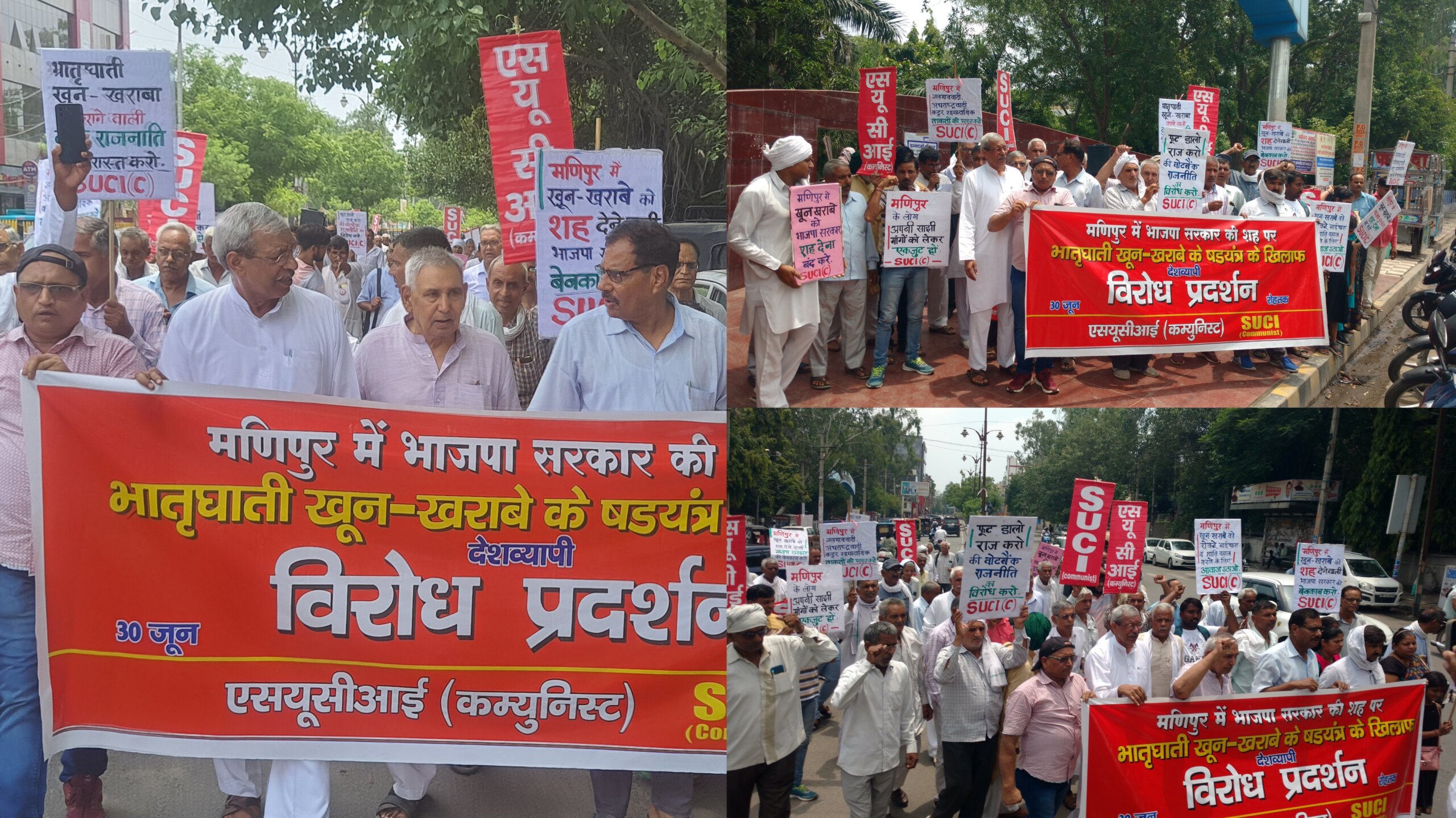 मणिपुर में शांति बहाल करने की मांग परएसयूसीआई कम्युनिस्ट की केंद्रीय कमेटी के आह्वान पर आज 30 जून को देशभर में विरोध दिवस आयोजित किया है। पार्टी ने मणिपुर के शांतिप्रिय लोगों के सभी तबकों का भी आह्वान किया है कि वे अपने पातों को सुदृढ़ करें और अलगाववादी, अंधराष्ट्रवादी, कट्टर सांप्रदायिक ताकतों को परास्त करें, उन्हें जनता से अलग-थलग करें और अपनी साझा ज्वलंत मांगों पर केंद्रित एकजुट जनवादी आंदोलनों के विकास का मार्ग प्रशस्त करें। इसी रास्ते मणिपुर के लोगों के सभी तबकों को शामिल करते हुए दृढ़ एकता और भाईचारा स्थापित हो सकेगा।